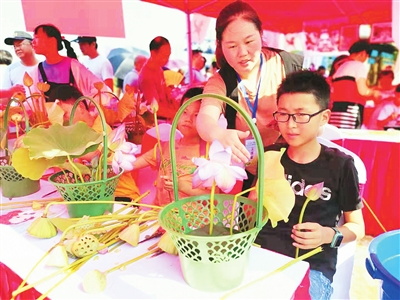 开幕式现场,不仅有丰富多彩的歌舞表演,市民还可以参与现场多种趣味体验活动。在荷花非遗剪纸中传承中国传统文化;在美食制作中动手学做藕粉圆子品味地方美食;在花艺插花中体验荷花风情感受园居生活魅力。