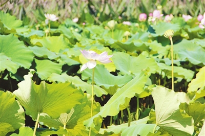 目前,园区内“繁星”“蝶恋花”“夏艳”等名贵品种已经渐次绽放,刚出水面的荷花在重叠的荷叶之间或举或藏、或开或闭、或躺或卧,浑然天成,充满野趣,静静等待着游客的欣赏。万亩荷花,摇曳生姿,美不胜收,给你一个清凉的世界。