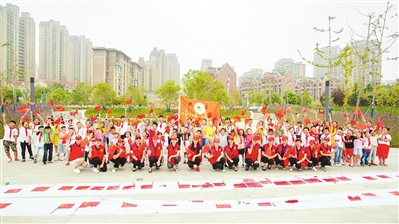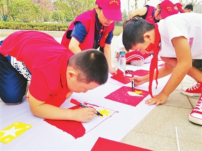 随后,近百名孩子拿着画笔,伏身在长长的画卷上,神情专注地精心描绘。不多时,画出一面面国旗,孩子们纷纷站起身来向国旗敬礼。活动最后在百名儿童和志愿者同唱《歌唱祖国》中结束。