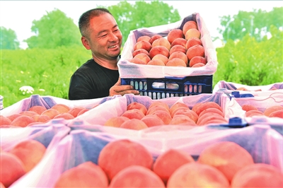 近日,八斗镇八斗社区的果农在采摘桃子,分拣后准备外销。时下,该镇近万亩水蜜桃、油桃进入成熟期,农民加紧采摘,供应市场。累累硕果让农民喜上眉梢,乐在心头。