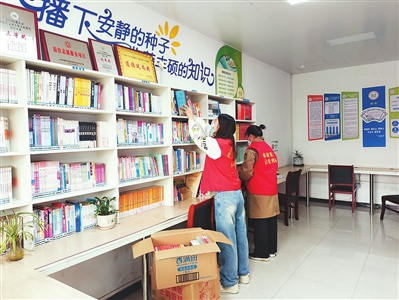 11月21日,店埠镇花园社区新时代文明实践站农家书屋迎来了由县直工委特地配送的近百本新书。图为书屋管理员将图书分类上架。