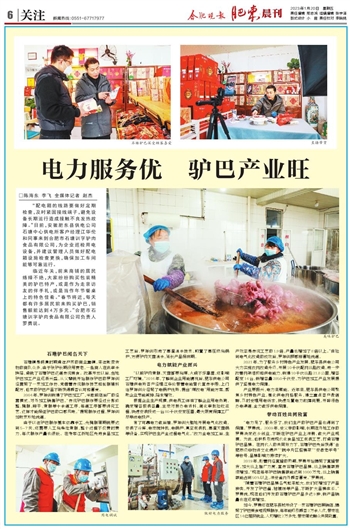 “电力足了,服务好了,我们生产的驴巴产品也得到了保障。”罗勇说。2009年,受父亲的影响,长期在外地工作的罗勇决定返乡创业,不断在驴巴产业上深耕,做大产业规模。为此,他积极引进现代化食品加工包装工艺,打造石塘驴巴品牌。在两代人的共同努力下,石塘驴巴先后获得“合肥市级非物资文化遗产”“皖中片区招牌菜”“安徽老字号”等称号,品牌影响力持续扩大。