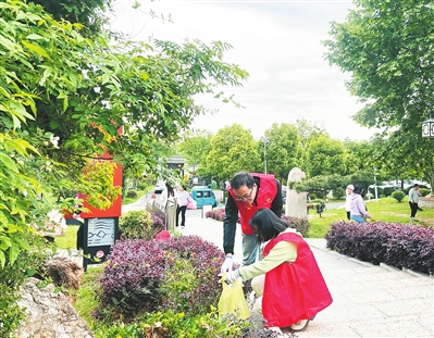 5月1日下午,长临河镇新时代文明实践志愿者们正在该镇四顶山景区捡拾垃圾,维护景区环境卫生,引导游客文明旅游。