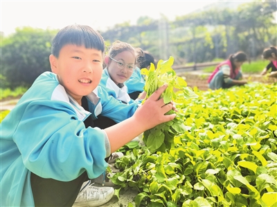 初冬的上午,在店埠学区中心学校“紫藤园”劳动基地里,一笼笼小青菜、大蒜、莴笋、香菜绿意盎然。在老师的带领下,该校六年级部分学生面带喜悦采摘着。室外的缕缕寒意,丝毫没有降低孩子们的劳动热情。只见他们熟练地从地里拔出小白菜,择去菜梗,摆放成堆,再分别装袋。孩子们边劳动边说笑,整个劳动基地热闹而井然有序,很快就收获近50袋蔬菜。