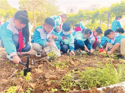 据了解,早在去年9月,店埠学区中心学校将劳动教育与学校实际相融合,积极探索具有本校特色的劳动教育模式,将位于学校少年宫前的一块建筑垃圾堆放地利用起来。通过平整土地、增加营养土、播撒有机肥等方式,开辟出占地面积40平方米左右的“紫藤园”劳动基地。