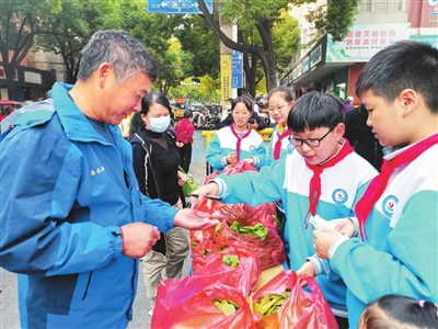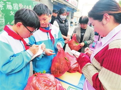听着孩子们稚嫩的吆喝声,不少接孩子放学的家长以及过往行人纷纷走上前。“哟,这个蔬菜很新鲜啊!”“白菜两块钱这么一大袋,真划算,关键还是纯绿色的。”不大的“小菜市”瞬间热闹起来,吆喝声、询问声、欢笑声此起彼伏。伴随着一袋袋蔬菜的递出,一旁的孩子们则分工协作,仔细而又认真地进行着收账报账工作。