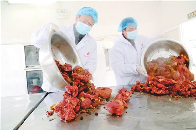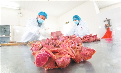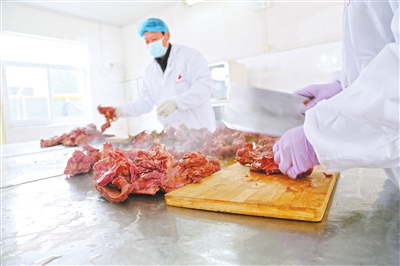 以前生产驴肉,大多数是用的当地饲养的驴。如今,石塘镇生产驴巴的商户们,基本上都是从外地买驴肉。“我以前也饲养过毛驴,但因为技术要求高,成本也大,所以后来就放弃了。现在,我们从甘肃、新疆、山东等地买驴肉,只要我们发出订单,就可以通过物流运来,十分方便。”老黄说。