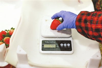 众所周知,草莓比较娇贵,按个头的大小,价格也不尽相同。在屋内,王昌友拿出一个小秤,他和工人把每一个草莓都放在秤上,按照克数的大小,进行分类装盒。墙上一块白板上写着分类标准:大果28克-30克以上,中果15克-28克,小果10克-15克。