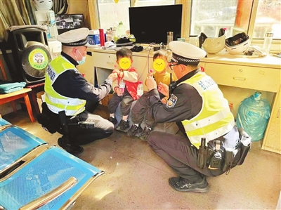 其间,民警一边安抚俩萌娃一边问其家长名字,由于俩萌娃年龄较小说不清楚家里的地址和家人的联系方式,徐海东、丁锐估计萌娃家就住在附近,便沿街挨家挨户问询,同时报告指挥中心是否有接到孩子走失的警情,然经过一个小时的努力仍然没有孩子父母的消息。