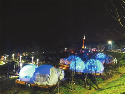 除此之外,营地还打造了众多露营体验新场景,“露营+美食”“露营+影院”“露营+运动”等新模式、新场景、新体验层出不穷。在天幕露营区,游客们围炉而坐,品尝着特色美味佳肴;在多功能草坪,飞盘比赛激战正酣,选手们挥洒汗水、收获喜悦;在夜幕下的露天剧场,点点灯光亮起,游人们安静地享受着户外影院带来的乐趣……